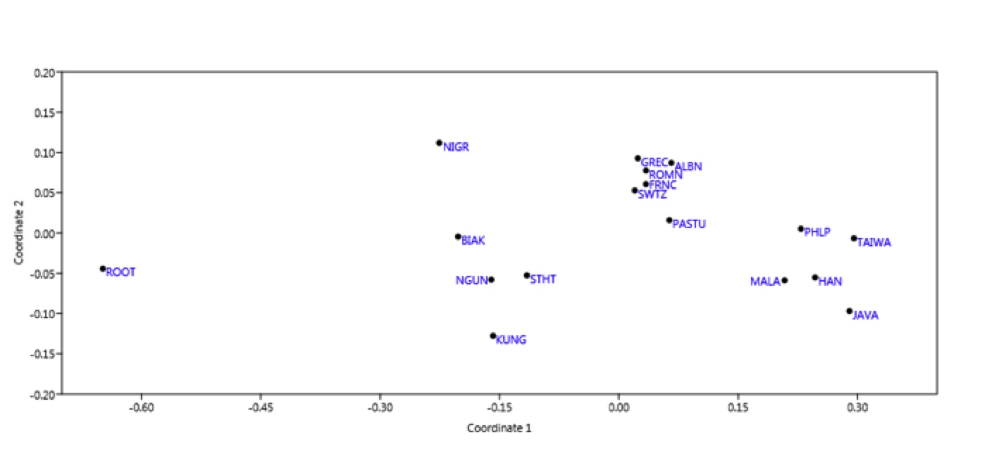 La posición de la población ancestral hipotética es más clara desde un punto de vista genético en el MDS. Aparece en un extremo, mostrando el origen del proceso de poblamiento de los diferentes continentes. Los Pastunes aparecen de nuevo en una posición intermedia entre europeos y asiáticos, pero en este caso alejados de la población raíz.