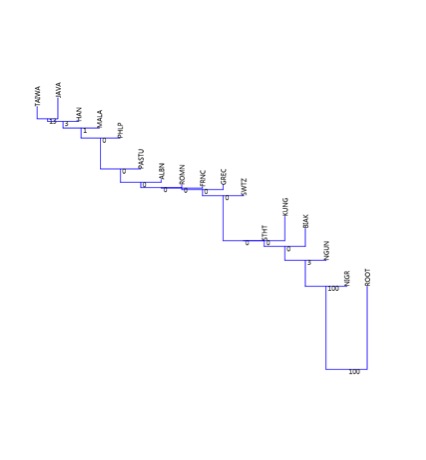 Los Pastunes aparecen en una posición intermedia entre europeos y asiáticos, de acuerdo a su posición geográfica y su historia. La población raíz (Root), aparece también en un lugar intermedio, reflejando de forma incorrecta su posición genética. Esto es debido a los valores de 0 en todas sus frecuencias, lo que da lugar a problemas de cálculo de la distancia chi cuadrado.