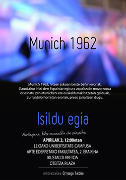 El miércoles, 2 de abril, a las 12:00, en la sala de proyecciones del Edificio 2 de la Facultad de Bellas Artes de la UPV/EHU (barrio Sarriena s/n, Leioa), se proyectará el documental "Munich 1962" realizado por la asociación cultural Orreaga. Tras la proyección, de media hora de duración, se llevará a cabo un coloquio sobre el momento histórico al que hace referencia la obra. La entrada será libre.