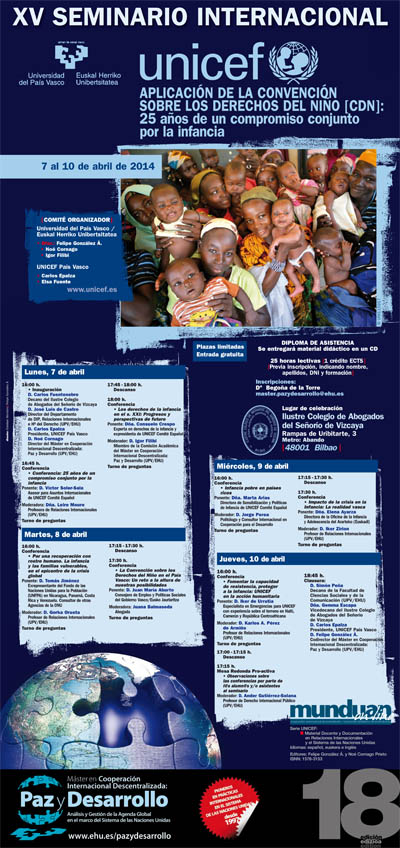 El lunes, 7 de abril, a las 16:00, en el Ilustre Colegio de Abogados del Señorío de Bizkaia (Rampas de Uribitarte, 3. Bilbao) dará comienzo el XV Seminario Internacional UNICEF bajo el título "25 años de un compromiso conjunto por la infancia", organizado por la UPV/EHU y UNICEF, en el marco del Máster en Cooperación Internacional Descentralizada: Paz y Desarrollo.