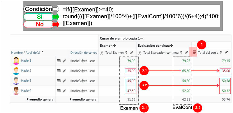 Como se puede ver en la tabla, el icono “Calculadora” indica que el cálculo se realiza con una fórmula personalizada (1). Un recuadro negro discontinuo señala las columnas incluidas en la fórmula (“Examen” (2.1) y “EvalCont” (2.2)). En el caso de Ikasle 2, su nota en el “Examen” es inferior al umbral establecido y, por lo tanto, esta nota se traslada directamente a la columna “Total del curso”. Sin embargo, en el caso de Ikasle 3 e Ikasle 4, sus notas superan este umbral y en la columna “Total del curso” se muestra la media ponderada de “Examen” y “EvalCont”.