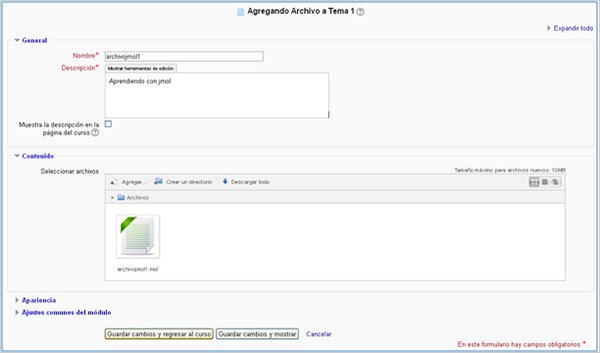 Se nos desplegará un formulario donde habrá que rellenar por lo menos los campos “Nombre” y “Descripción” - que son obligatorios. En el apartado “Contenido” agregaremos el archivo jmol siguiendo las indicaciones del documento sobre “Gestión de recursos en eGela” y pinchamos en “Guardar cambios y regresar al curso”.