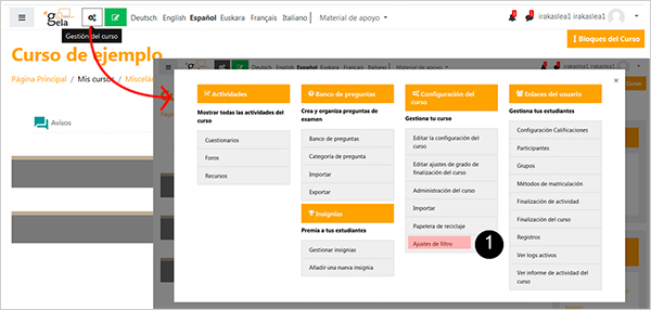Cada uno de estos filtros puede desactivarse, tanto a nivel del recurso o actividad, como a nivel del curso. Para acceder a la configuración de filtros a nivel de curso abrir el panel "Gestión de curso" y pulsar sobre "Ajustes de cursos".
