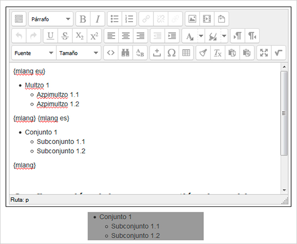 Es necesario editar el código HTML y su edición es compleja. Como ventaja, muestra el idioma de la plataforma por defecto en ausencia de una versión específica en el idioma seleccionado para la navegación, siendo euskera el idioma configurado por defecto. La siguiente imagen muestra el código necesario para mostrar el contenido incluido en el recuadro gris, teniendo seleccionado “Español” como idioma de navegación.