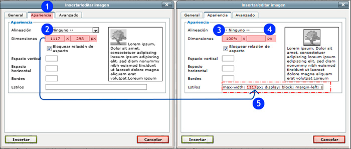 En la pestaña "Apariencia" (1), copiamos el valor que aparece en el campo anchura (2) y lo sustituimos por 100% (3). El campo de la altura (4) debe quedar vacío. Finalmente, en el campo "Estilos" pegamos las siguientes indicaciones, sustituyendo "ANCHURA" por el valor que hemos copiado en el campo anchura.