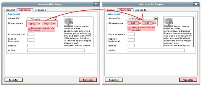 También puede ser interesante cambiar las dimensiones de la imagen. En primer lugar, y teniendo en cuenta que en una página de eGela / eGelaPI una imagen difícilmente podrá ocupar un espacio superior a 1000px, podemos reducir su tamaño antes de publicarla, usando una herramienta de edición externa. Si no optamos por esta opción, podemos ajustar la anchura de la imagen, manteniendo marcada la opción "Bloquear relación de aspecto".