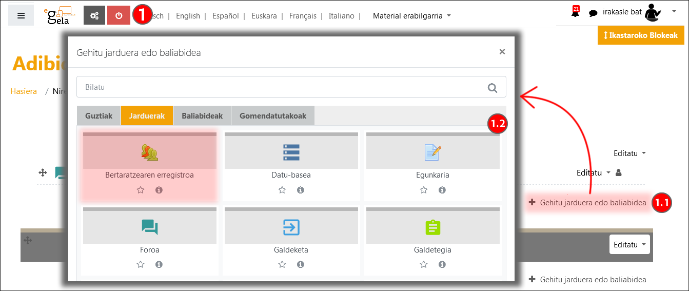 Zure ikastaroan bertaratzearen erregistro modulua aktibatzeko, aktibatu ikastaroaren edizioa (1), sakatu "gehitu jarduera edo baliabidea" (1.1) eta aukeratu Bertaratzearen erregistroa (1.2) motako jarduera.