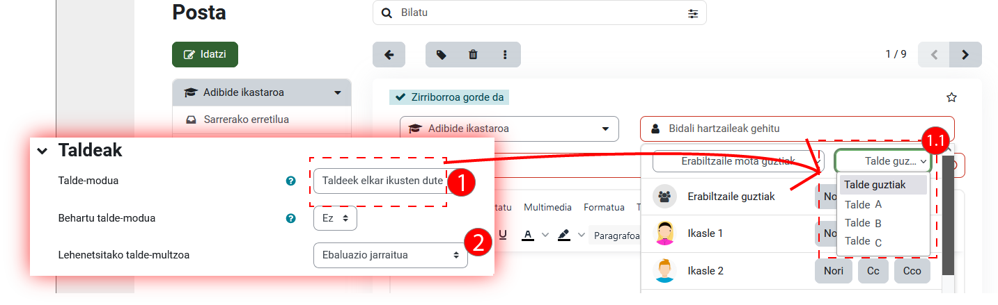 Ikastaroko “Partaideak” zerrendan hautatutako hartzaileei mezu elektronikoak bidaltzeko aukera ere badago, “Posta bidali” botoia sakatuz (1). Hautaketa egiteko, goiko aldeko iragazkiak erabil daitezke, adibidez, talde-iragazkia (1.1). Ondoren, zerrendan hartzaile guztiak edo batzuk hauta daitezke (1.2).
