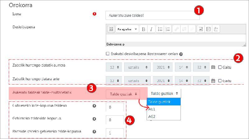 Jarduera konfiguratzeko formularioak 3 atal espezifiko ditu. Hurrengo irudian "Orokorra" atala agertzen da. Bertan, jardueraren “Izena” ez ezik, izena emateko epea ere zehaztu daiteke (2). "Aukeratu taldeak talde-multzoetatik" (3) eremuan talde-multzo bat hautatuz gero, talde-multzo horretako taldeak bakarrik aukeratu ahal izango dira. Azkenik, beste aukera multzo batek (4) taldeko kideen gutxieneko eta gehieneko kopuruak eta aukera daitekeen gehieneko talde-kopurua ezartzeko aukera ematen du.