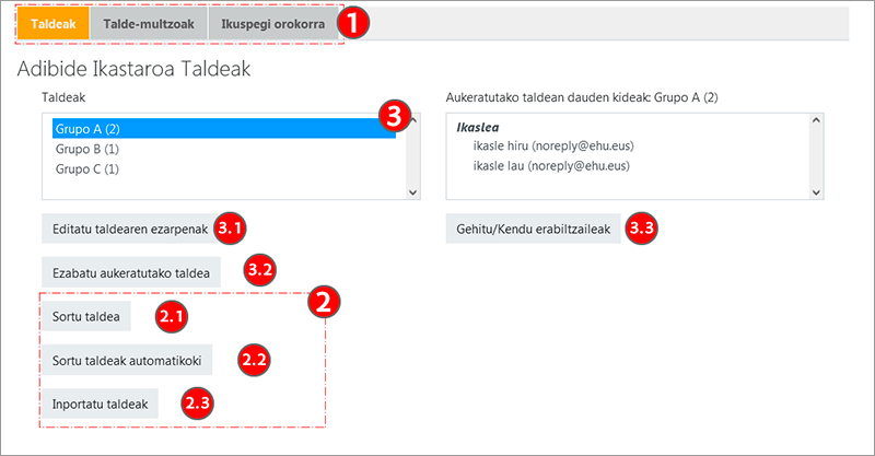 Orri honetan aukera hauek daude, hiru fitxatan antolatuta (1): "Taldeak", "Talde-multzoak" eta "Ikuspegi orokorra". Irudian, Taldeak fitxan dauden aukerak agertzen dira.