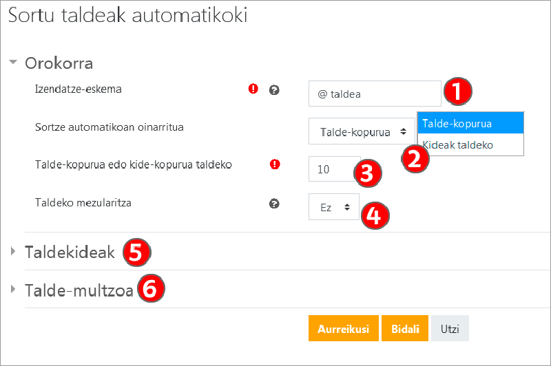 “Sortze automatikoan oinarritua” (2), "Talde-kopurua" edo "Kideak taldeko" irizpideen artean hautatzeko aukera ematen du. Gainera, "Taldekideak" (5) atalean, hainbat irizpide hauta daitezke banaketa zein erabiltzaile-multzotan egingo den hautatzeko. "Talde-multzoa" atalak (6) aukera ematen du talde-multzo berri edo lehendik dagoen batean sortutako taldeak antolatzeko.