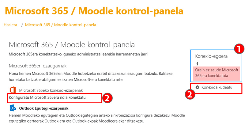 “Microsoft 365/ Moodle kontrol-panela" orrian konexio egoera adierazten da (1). Lotura gauzatzeko, sakatu “Konexioa kudeatu” (2) edo “Microsoft 365eko konexio-ezarpenak” (2).