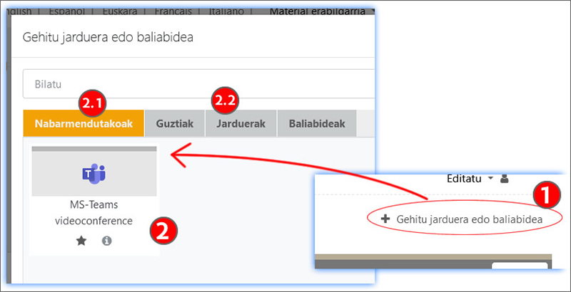 Ikastaroan edizioa aktibatuta dagoela sakatu “Gehitu jarduera edo baliabide” (1) eta aukeratu “MS-Teams Bideokonferentzia" (2). Irudian, “Nabarmendutakoak” (2.1) fitxan agertzen da, aurretik “Nabarmendu” bezala markatu delako, baina “Jarduerak” (2.2) fitxan ere aurki daiteke.