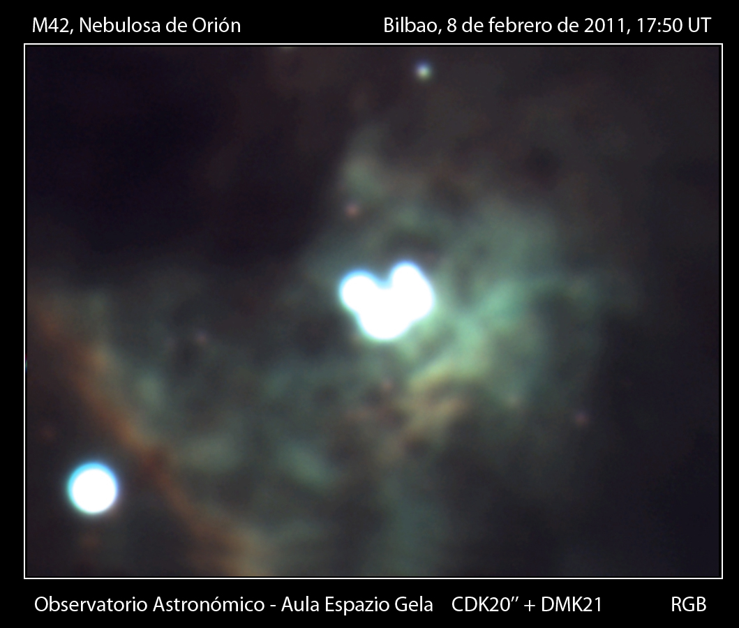 observación de objetos del cielo profundo: Galaxias, nebulosas y cúmulos estelares. Todas las fotos expuestas en esta galería han sido adquiridas desde el Observatorio Astronómico Aula EspaZio Gela, en el edificio de la Escuela Técnica Superior de Ingeniería de Bilbao, situada en pleno centro de Bilbao junto alguna de sus vías de acceso principales, por tanto inmersas en plena contaminación lumínica urbana. En los siguientes enlaces puedes acceder directamente a cada una de las secciones de esta galería. Pincha sobre las imágenes para verlas a tamaño completo.