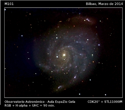 M101 o Galaxia del Molinillo es una de las últimas entradas del catálogo de Charles Messier. Es una hermosa galaxia espiral situada en la constelación de la Osa Mayor. De ella nos separan unos 20 o 25 millones de años-luz. Posiblemente debido a la presencia de algunas galaxias acompañantes, la estructura espiral se encuentra enormemente expandida, lo que la hace casi tan grande como nuestra Galaxia.