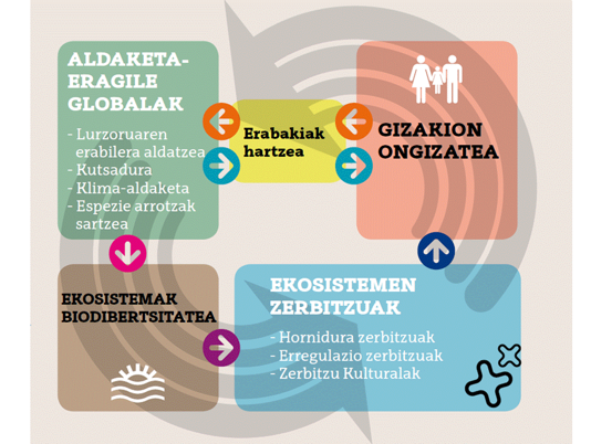 Las decisiones políticas influyen sobre los impulsores de cambio global. Estos impulsores de cambio pueden provocar cambios en los ecosistemas, y por tanto, afectar al flujo de servicios que éstos proporcionan a la sociedad. Estos servicios son la base del bienestar humano y de su buen funcionamiento depende el futuro económico, social, cultural y político de las sociedades humanas, por lo que su conservación es prioritaria.