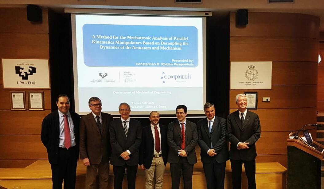 On 7th April 2017 Constantino G. Roldán Paraponiaris defended his PhD Thesis – A method for the Mechatronic Analysis of Parallel Kinematics Manipulators Based on Decoupling the Dynamics of Actuators and Mechanism. Fran Campa has been the Advisor of the PhD Thesis and the jury was formed by Oscar Altuzarra and Alfonso Hernández from the University of the Basque Country (Spain), B. Corves from the IGM – RWTH Aachen (Germany), Vicente Mata from the Polytechnic University in Valencia (Spain) and Andrés Keckskemethy from the (Germany).