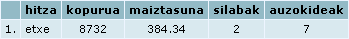 "Hitza bera" aukeratuz gero, hitz baten inguruko informazioa ematen digu. Demagun "etxe" hitza. Hau aterako zaigu: