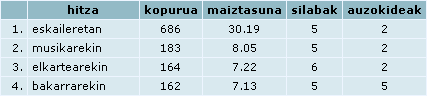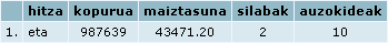 Beraz: ezkerreko aldean zehazten da nolako informazioa bilatu nahi den, eta eskuineko aldean ikusten dugu informazio hori, guk aukeratzen dugun modura ordenatua ("maiztasunez" edo "alfabetoz") eta osatua ("murriztua" edo xehetasun guztiekin -"guztiak").