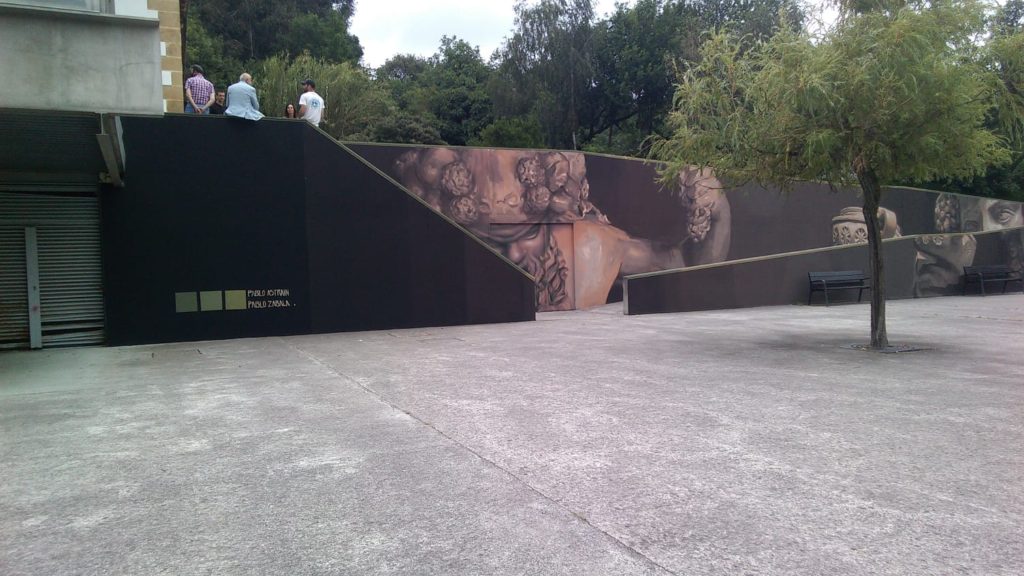 Ya está inaugurado el nuevo mural titulado “Conversación en el templo” de los artistas Pablo Astrain y Pablo Zabala en el Mendibile Jauregia de Leioa. Como cada año gracias a la colaboración entre la Asociación Mendibile Jauregia, la D.O. de Bizkaia, el Ayuntamiento de Leioa y al Máster de Pintura de la Facultad de Bellas Artes, se ha presentado la propuesta mural ganadora de la convocatoria 2020 para el exterior del Mendibile Jauregia.
