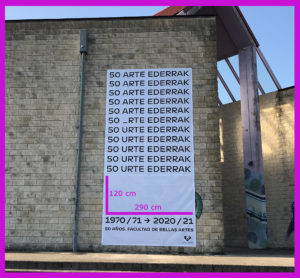 2020/2021 ikasturtean zehar UPV/EHUko Arte Ederren Fakultateak 50 urte egingo ditu, orduko Bilboko Arte Ederren Eskolako lehenengo ikasturtea hasi zenetik. Data hori ospatzeko programaturiko jardueren artean, deialdi hau argitaratzen da, fakultateko eraikin nagusiaren fatxadan dagoen “50 ARTE EDERRAK / 50 URTE EDERRAK” olanan esku hartzeko proposamen bidimentsionalak aukeratzeko, gehienez hiru.