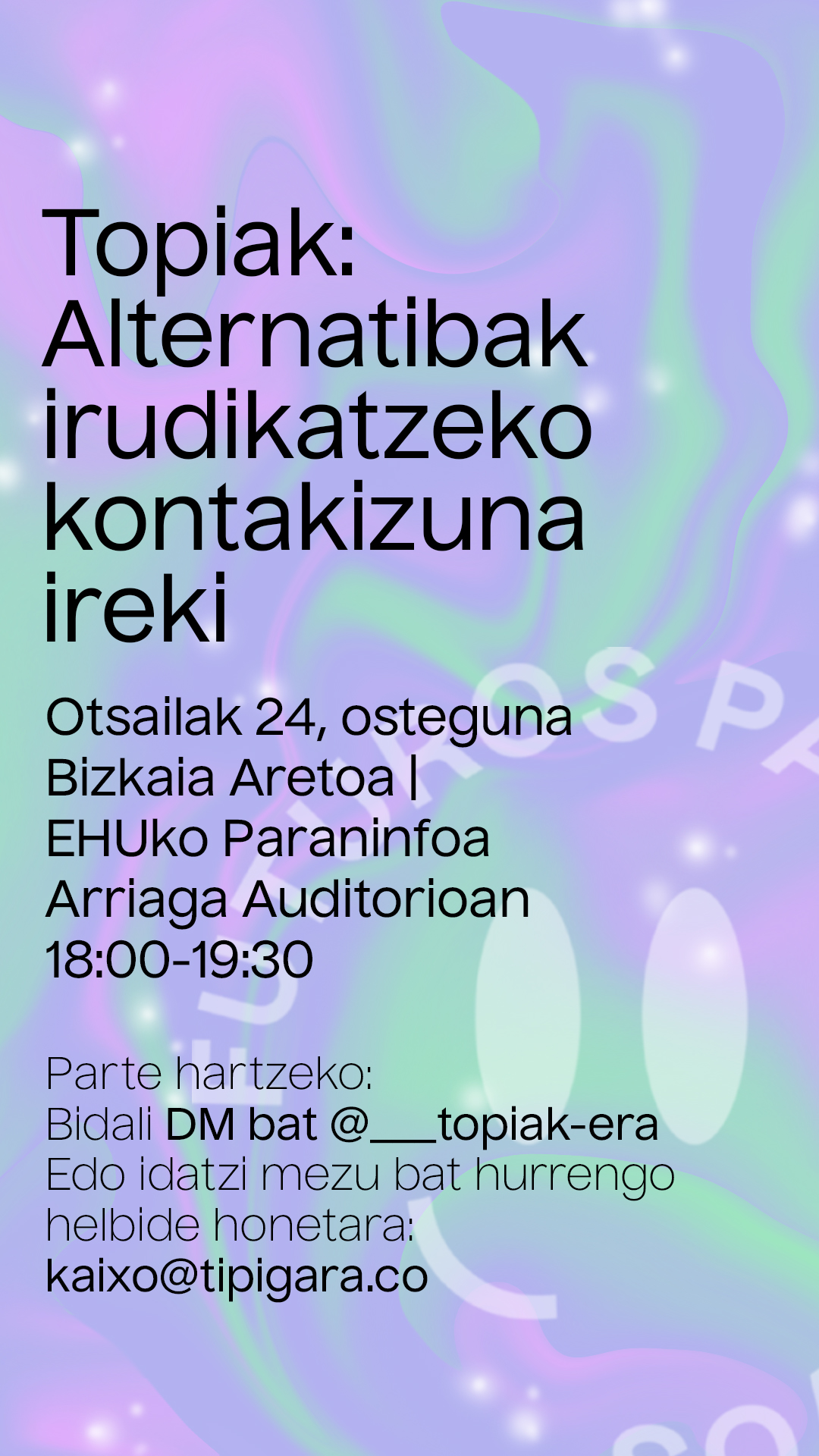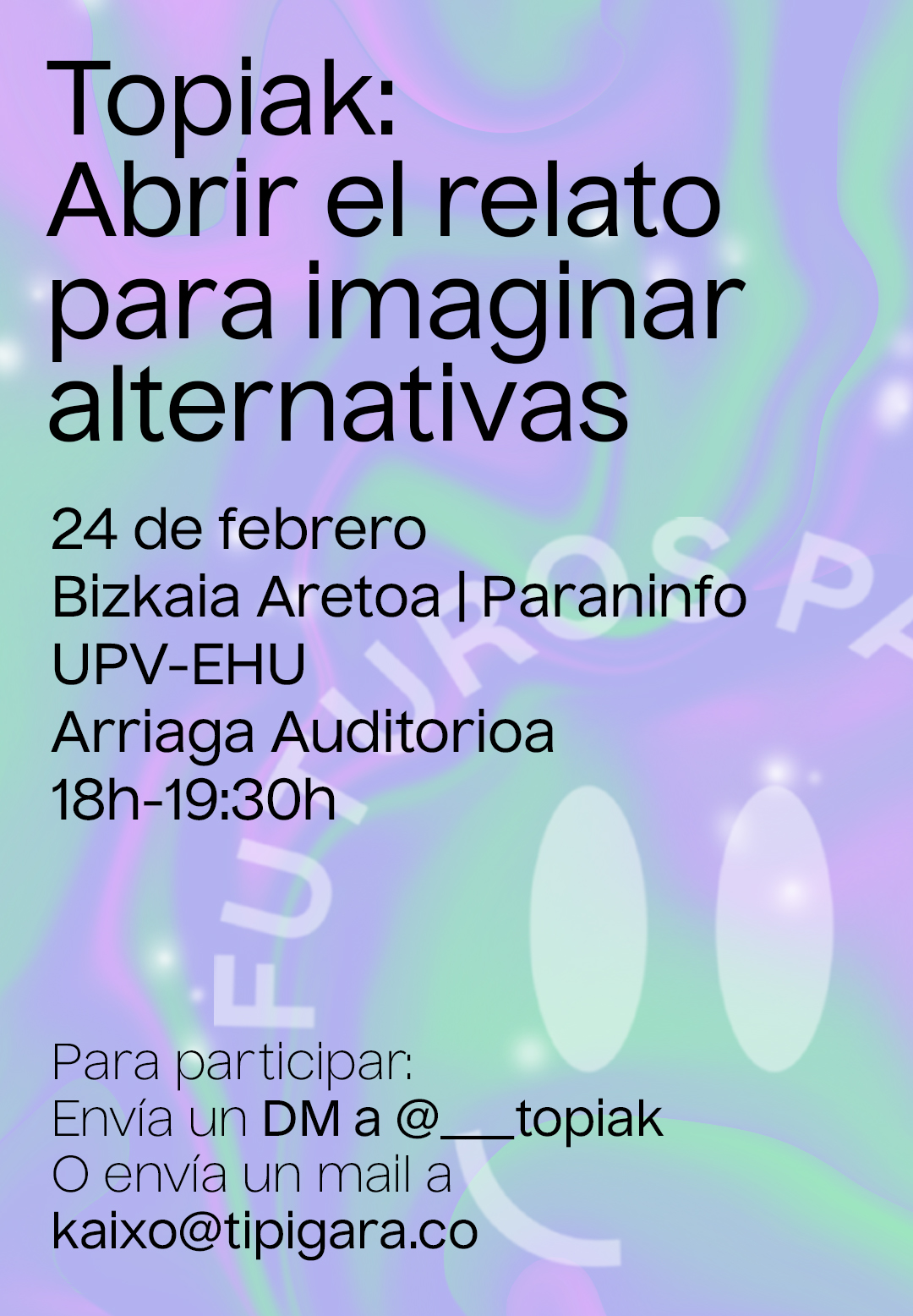Deialdi hau TOPIAK ikerketa-proiektuaren parte da. Topiak, bitartekaritza-prozesuetan ikuspegi espekulatiboak aztertzeko eta esperimentatzeko motibaziotik sortzen da, bai eta praktika artistikoen, Etorkizuneko Ikasketen eta Diseinu Espekulatibo eta Kritikoaren arteko elkargunetik sortzen diren perspektiba eta taktiketatik ere.