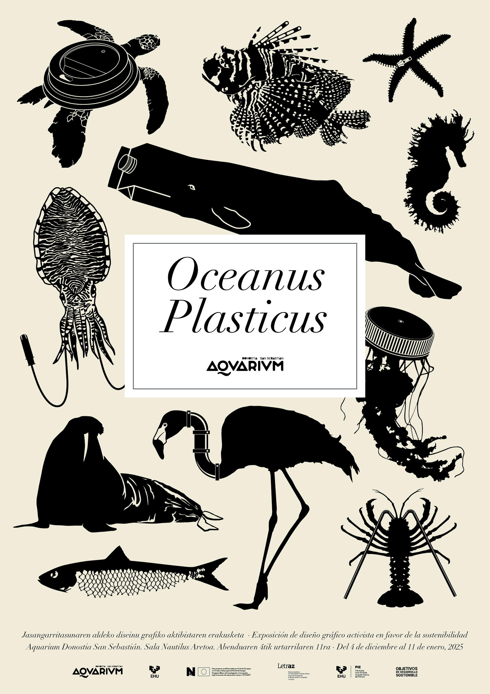 La exposición Oceanus Plasticus es el resultado de un proyecto de diseño gráfico planteado por los profesores Leire Fernández y Eduardo Herrera, en colaboración con la Estación Marina de Plentzia (PiE-UPV/EHU), y desarrollado en el Grado de Creación y Diseño de la Facultad de Bellas Artes de la Universidad del País Vasco.