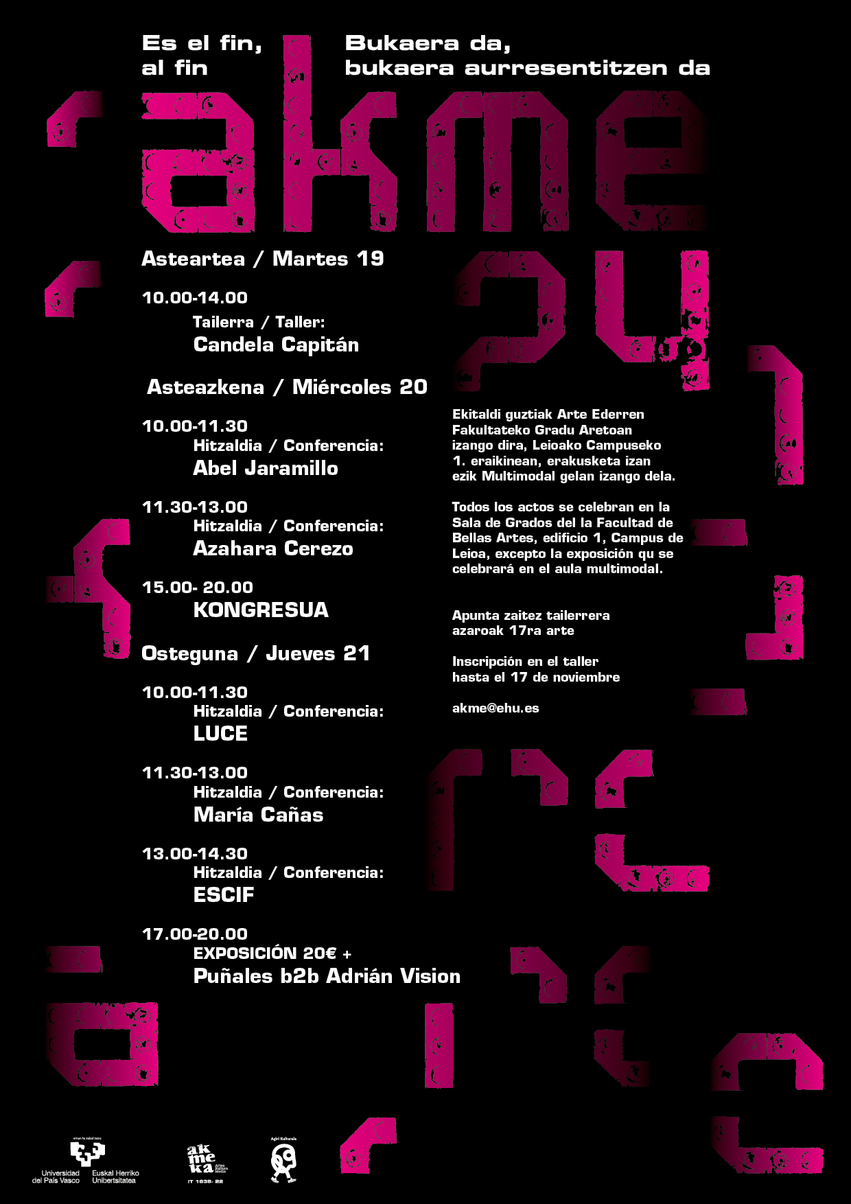 ACTIVIDAD VÁLIDA PARA AGIRI KULTURALA: 5 horas teórico-prácticas AGIRI KULTURALERAKO BALIODUN JARDUERA: 5 ordu teoriko-praktikoak Aurtengo deialdian Aline Michele Abrego-ren “Toltecáyotl ederrak” izeneko proposamena aukeratua izan da. Eskerrik asko lanak aurkeztu dituzuen guztioi! Irudia: aurtengo pieza irabazlearen zati bat. En la edición de este año ha sido seleccionada la propuesta titulada “Toltecáyotl ederrak” de Aline Michele Abrego. Gracias a todas las que habéis presentado vuestras propuestas! Imagen: Fragmento de la pieza ganadora. AZAROA 20 NOVIEMBRE – MIERCOLES / ASTEAZKENA Sala de Grados / Gradu Aretoa Arte Ederren Fakulatea / Facultad de Bellas Artes – Leioa Ordua / Hora: 15.00 -20.00 10 minutuko parte hartzeak. – Alexia Sayago, – Ander Gómez, – Anna Fimberguer, – Soreen Lizaso, – Annat Valles, – Beñat Krolem, – Marian Infante, – Concha García de la Fuente, – Elisa Villota, – Javier Martínez, – Cris na Souto, – Joan Fierro, – Sara Santos, – Mireya Moral, – Paula Fuentes. ACTIVIDAD VÁLIDA PARA AGIRI KULTURALA: dependiendo de la asistencia a las jornadas completas o por días AGIRI KULTURALERAKO BALIODUN JARDUERA: asistentziaren arabera, egunekoa bada edota jardunaldi osokoa |