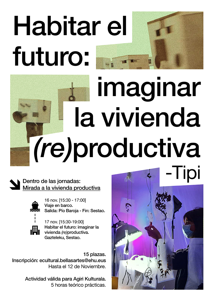 Habitar el futuro: imaginar la vivienda (re)productiva: Taller participativo de especulación y debate en donde imaginaremos la vivienda del futuro y la materializaremos a partir de distintos objetos y artefactos. 15 plazas, Necesaria inscripción ecultural.bellasartes@ehu.eus Hasta el 12 de noviembre