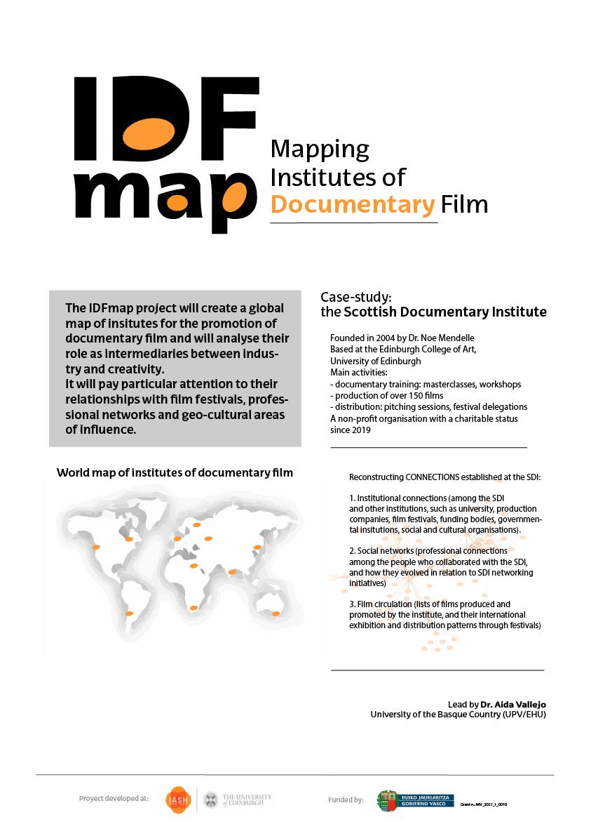 Liderado por la profesora de la UPV/EHU Aida Vallejo, el proyecto de investigación IDFmap: Mapping Institutes of Documentary Film se desarrolla en el Institute for Advanced Studies in the Humanities de la Universidad de Edimburgo. https://www.iash.ed.ac.uk/profile/dr-aida-vallejo
