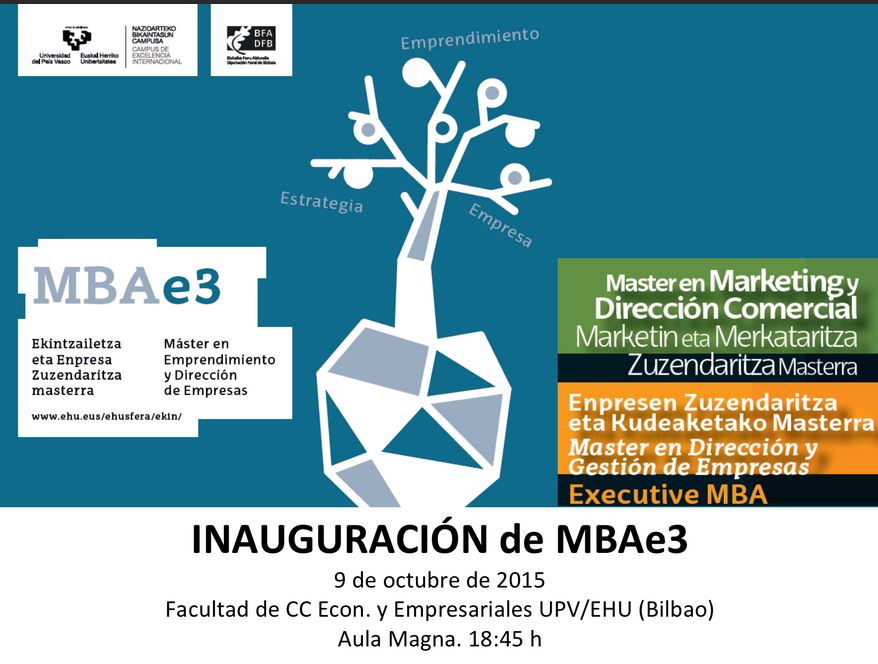 Hoy, 9 de octubre, a las 18:45 h de la tarde, se inauguran oficialmente tres Másteres en UPV/EHU. Son el Máster en Dirección y Gestión de Empresas-Executive MBA, el más veterano de UPV/EHU, que este curso 2015-2016 inicia su 28 edición consecutiva, el Máster de Marketing y Dirección Comercial en su 27 edición consecutiva, y el nuevo