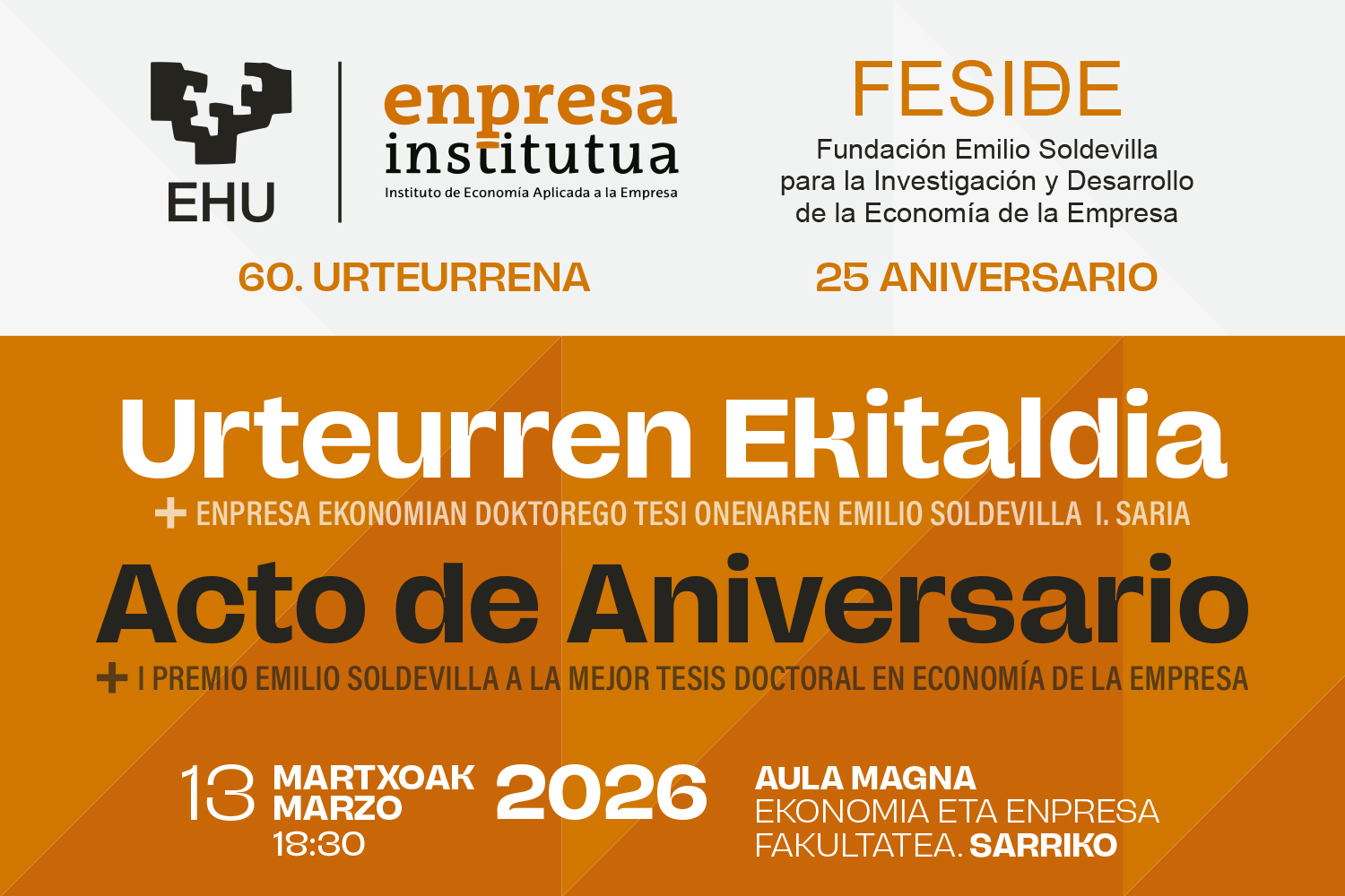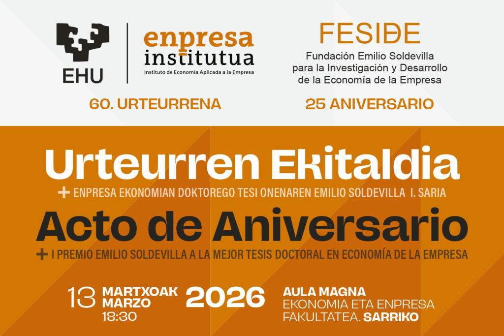 Enpresa Institutuak eta Enpresaren Ekonomia Ikertu eta Garatzeko Emilio Soldevilla Fundazioak (FESIDE) ekitaldi bateratua egingo dute martxoaren 13an, EHUko Ekonomia eta Enpresa Fakultateko Areto Nagusian (Sarriko), institutuaren 60. urteurrena eta fundazioaren 25. urteurrena ospatzeko. Joxerramon Bengoetxea EHUko errektorea buru dela, bertan elkartuko dira erakundeetako goi-ordezkariak eta esparru akademiko, instituzional eta enpresarialeko ordezkariak.