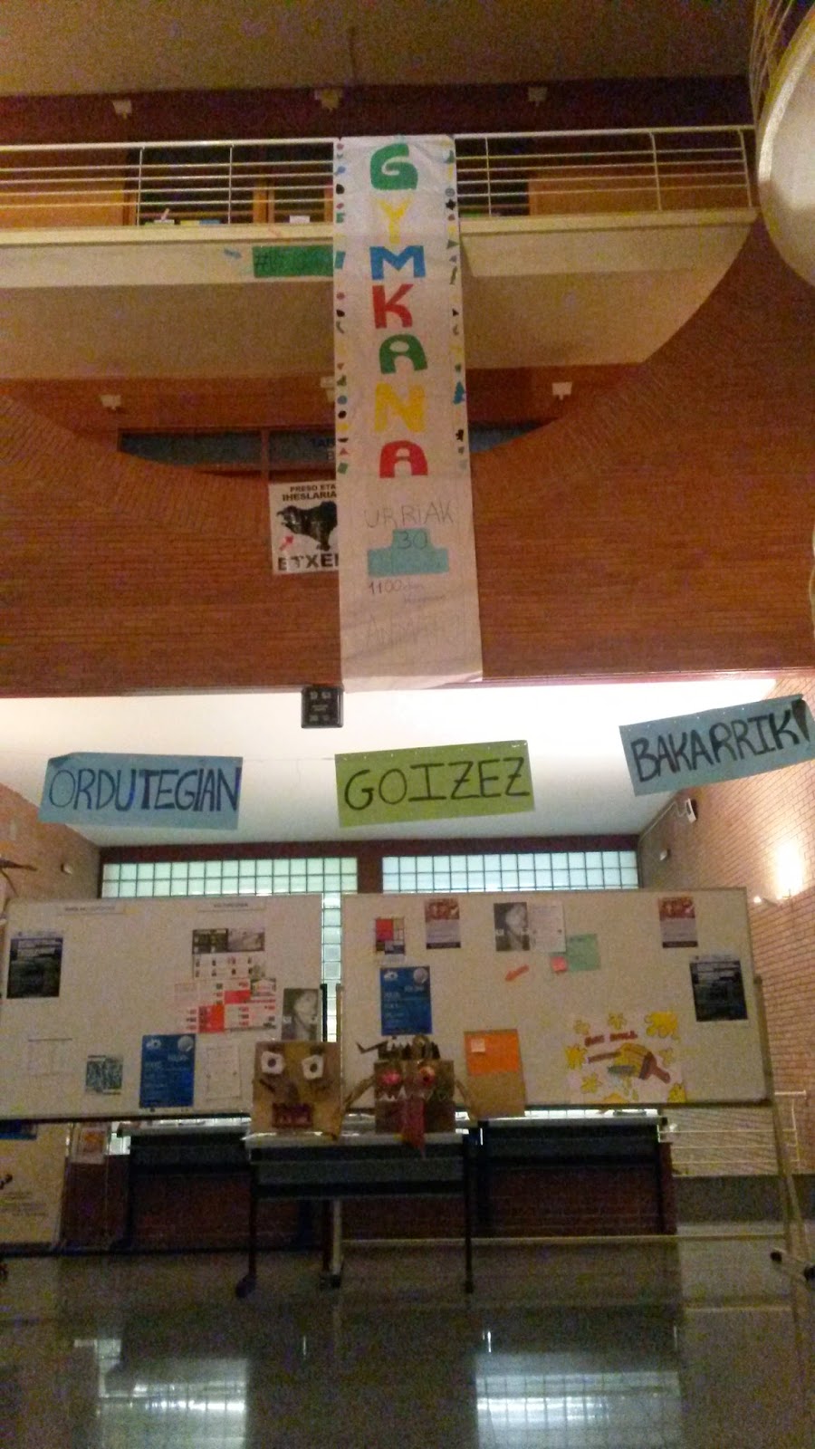 - Gymkana bat belardian antolatzea, nahi duen edonork parte har dezan. Gymkana hau bihar egingo dugu, osteguna, urriaren 30ean 11etan, eta kontatu ezin ditudan sorpresak egongo dira… baina bertatik pasatzen bazarete, ez izan zalantzarik eta parte hartu, helburua da elkarrekin ondo pasatzea! Antolaketa honetan, proposamena egin zuen taldea lagundua izaten utzi die besteei, eta horrek asko irakatsi digu kolektiboki lan egitea zer den ulertzen. Proiektuaren “arrakastari” lehentasuna eman ordez, elkarrekin lan egitea izan da inportanteena, elkar zaintzea eta elkarri laguntzea. Gymkana iragartzeko pankarta Magisteritzako 3. pisutik 1.era jaisten da: