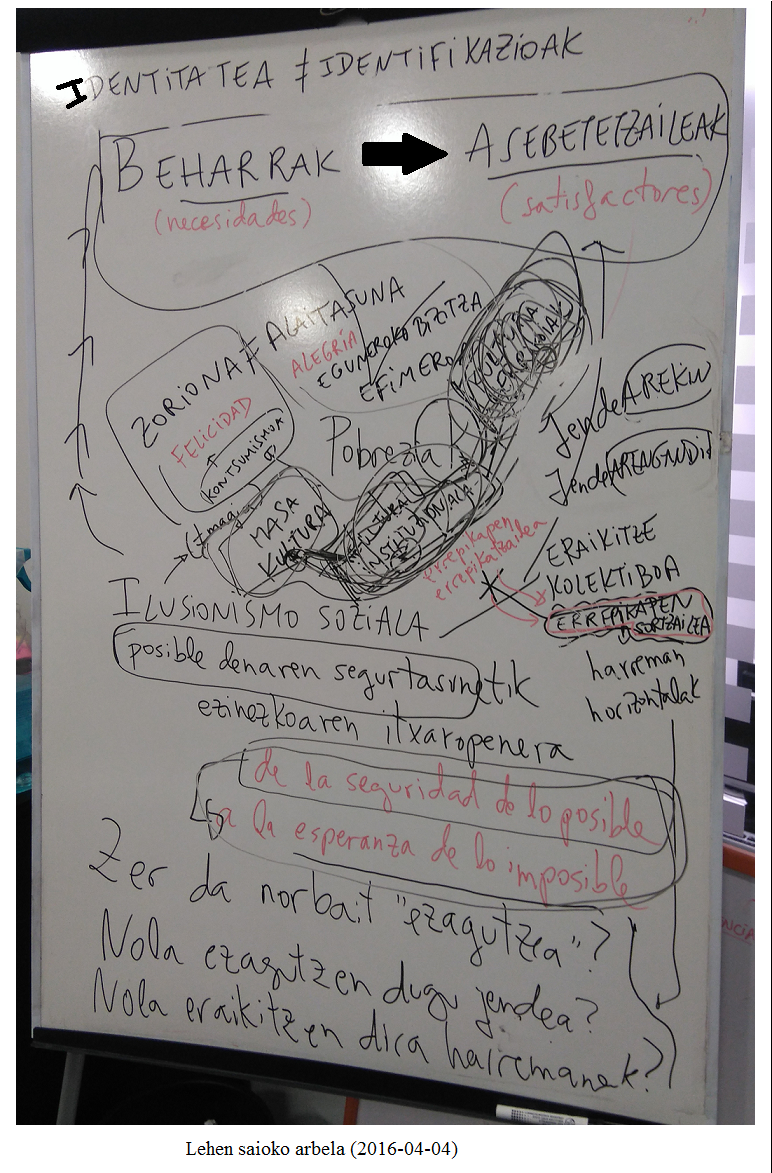Irakurritako testu-zatitik abiatuta, beharrak eta asebetetzaileak izan genituen hizpide. Honek inplikatzen du egiten dugunari buelta ematea: kontua ez litzateke izango ikasleei norbaitek (gobernuak, zuzendaritzak, klaustroak…) agindutakoa ahalik eta azkarren eta egokien ikasaraztea (eraginkortasuna), baizik eta zein giza-behar ari garen asetzen klasean egiten/pentsatzen/sentitzen dugunarekin: bizi-iraupena (osasuna, elikadura, lana…), babesa, afektua, ezagumena, partaidetza, aisia, sorkuntza, identifikazioa, askatasuna…