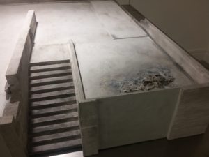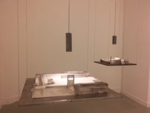 - Dos maquetas , “Desolaciones II” y “Desolaciones VII”, realizadas en diversos materiales, predominando la madera y la escayola que adquieren un aspecto desamparado gracias al uso de un color blanco “roto”. En ellas se da, como en las fotografías, la relación entre objetos y escenario destacándose algunos elementos narrativos como son el sillón, la puerta, los árboles amputados y quizá muertos , el montón de escombros y las escaleras, de un contorno mas plástico e indeterminado que gracias a a los elementos figurativos se tematiza . Estas maquetas son los elementos más realistas del conjunto de la exposición.