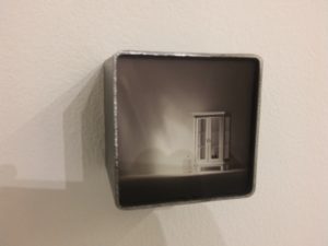 - Varias fotografías de distintos tamaños que como dice la hoja de exposición son “imágenes sobreescaladas , sobreexpuestas, negras y blancas y con efectos de hiperrealidad matérica” que también rememoran otras obras , también fotográficas y sobre escaladas, impresas sobre planchas de metal de la escultora Cristina Iglesias. Como en ellas, lo diminuto se agranda perdiéndose por momentos , en el caso de las de Iglesias, la realidad del tamaño de lo que en origen son cajas de cartón . Este doble juego de entrar en la ficción y reconocer la realidad que la contradice no se da en el caso de las fotografías de Llamas porque es muy evidente que los objetos son sillas en miniatura . Hay en esas fotografías algo que destaca , además de la narración en la que quiere sumergirnos, y es el juego de enfoque de primer plano y gran desenfoque del fondo lo que sugiere poca profundidad de campo, cierta ilimitación del espacio y un efecto teatral de concentración en la escena .