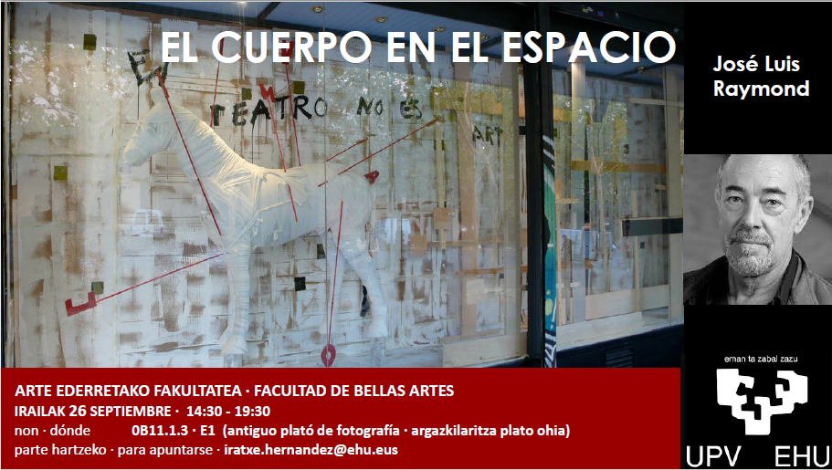 El próximo lunes 26 de septiembre celebraremos la jornada “El Cuerpo en el Espacio” dirigida por José Luis Raymond, en el antiguo plató de fotografía (0B11.1.3) del edificio 1 de la Facultad de Bellas Artes entre las 14:30 y las 19:30.
