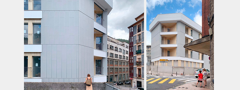La reconversión de los antiguos juzgados de Eibar en alojamientos dotacionales se plantea tras un intenso análisis de la configuración y el estado de conservación del edificio original. Como punto de partida, el núcleo de comunicaciones se sitúa en el eje central del edificio, junto a la medianera. De esta forma, se disminuye la afección del nuevo esquema sobre la estructura existente y se optimiza la relación de la escalera con el distribuidor central. En cuanto al exterior, una cuidada composición de huecos y vacíos otorga al edificio una imagen renovada que se integra perfectamente en el entorno construido. Se cree firmemente en la necesidad de poner en valor y dotar de calidad no sólo a los propios alojamientos, sino a todo el edificio, englobando tanto los espacios comunes como la propia envolvente, que define su relación con el entorno urbano.