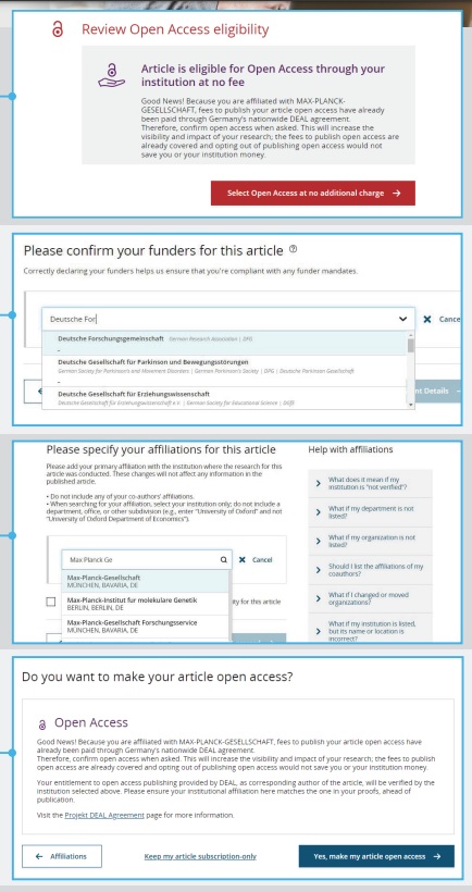 Egile arduradunaren afiliazioa baieztatu edo editatu behar da. Aukera lehenetsi gisa, artikulua bidali den unean adierazitako afiliazioa jasoko du Wileyk. “Verified” mezua agertuko da Ringgold datu baseak aitortutako erakundeen kasuan. Baliteke, halaber, Wileyk “Author services” prozeduraren hasieratik aitortzea egilea erakunde batean afiliatuta dagoela. Hainbat afiliazio adieraz daitezke, eta APCen kostua zeinek ordainduko duen aukeratu. Akordioari atxikitako erakundeak “Open Access” laukitxo purpura batez identifikatuta daude.