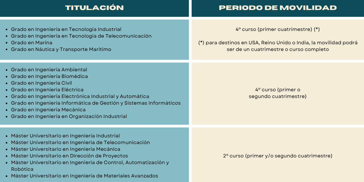 La movilidad puede realizarse en 4º de grado o en 2º de máster (únicamente para los másteres de 90 y 120 créditos), según la tabla siguiente. Es importante que tengas en cuenta que la movilidad se solicita durante el primer cuatrimestre del curso académico anterior a la movilidad (ver apartado de Solicitud).