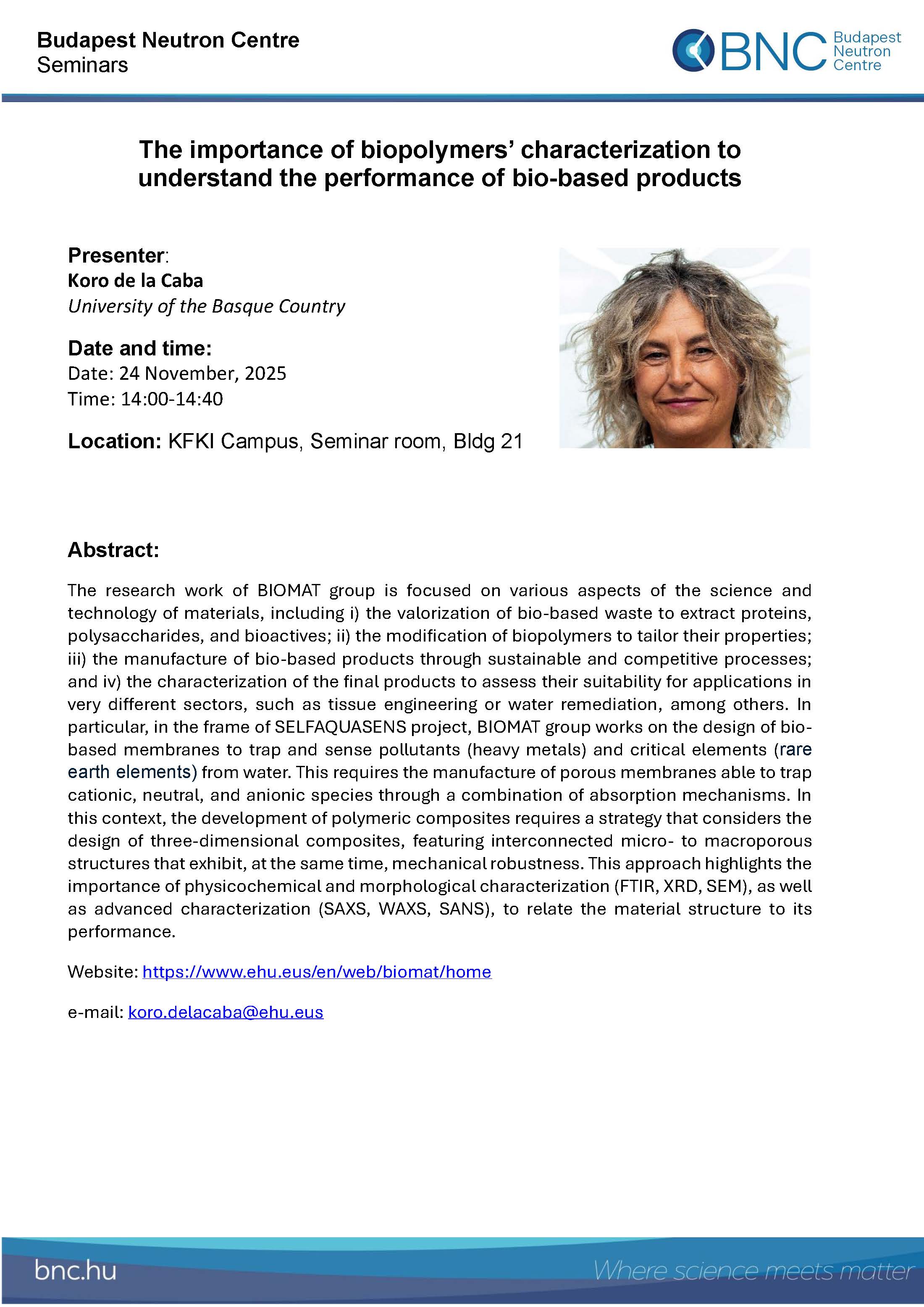 Dr Koro de la Caba has given a talk entitled “The importance of biopolymer characterization for understanding the performance of bio-based products” at the Budapest Neutron Center (BNC). Dr Koro de la Caba and Dr Pedro Guerrero are currently conducting a scientific stay at BNC in the framework of SELFAQUASENS project.