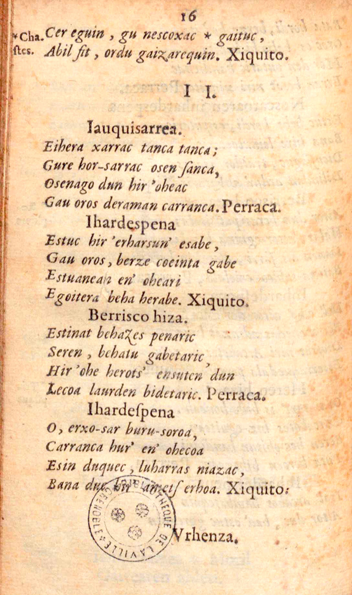Joy, but at the same time questions arose. What were those poems? I immediately saw that one of the first pages contained one of Oihenart's classic love poems, as these have a poetry metre that has never been used. I think he wanted to show that poetry in Basque could use many kinds of metres. But the 'Jorraleen koplak' (The Slanderers' Verses) on the last pages made a significant contribution to literature, because they have taught us new things and, moreover, because, until now, we did not know that Oihenart had paid any attention to the folk tradition. Another important question also occurred to me. The title of the work appears on the first page, and is immediately followed by the poems. This booklet seemed to be a continuation of something else, but at the same time it is the first page. Why did Oihenart do that?