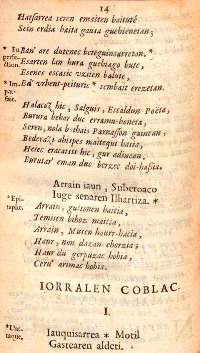So he began to analyse what Oihenart did with other works taken to press. Bilbao then saw that nearly all of Oihenart’s works were collections of separate booklets, and he suspects that the author also acted in a similar way with his poems, in other words, he had produced a collection of poems that until now we know under the title 'Ot-en gaztaroa neurtitzetan'”, and then another collection, probably a continuation of it, called 'Kobla berriak'. Oihenart may have been planning to publish them all at the same time.