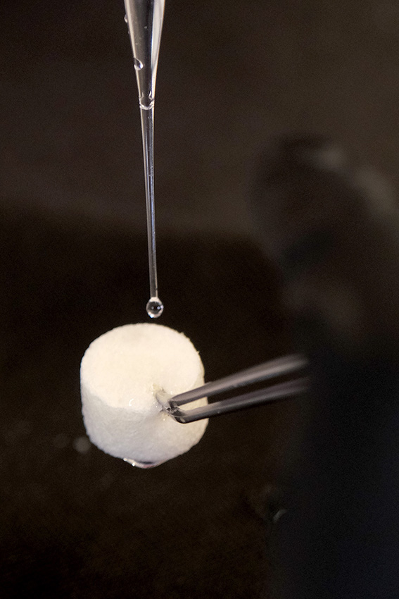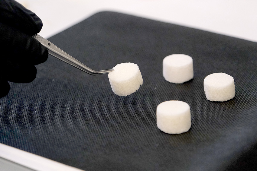 "Using natural by-products of the food industry –soy protein and chitin– we developed a scaffold or spongy matrix that displays a series of very interesting physicochemical properties: it is capable of absorbing huge quantities of water or blood, it has a large surface area to bind and house cells inside it, it does not produce any kind of rejection against the material and, what is more, it partially degrades," said the UPV/EHU researcher.