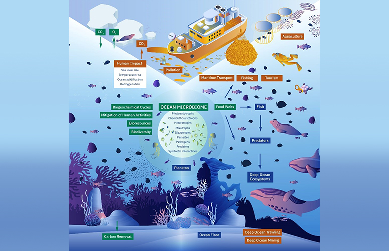 A well-functioning ocean microbiome depends on diverse, abundant microbial communities. Threats such as global warming, sea ice melt, ocean acidification, coastal degradation, overfishing and pollution can distort it and undermine its productivity.