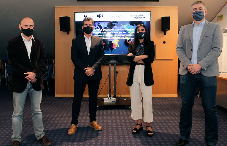 The Vice-Chancellor of the UPV/EHU-University of the Basque Country, the CEO of the Technological Research and Development Centre TECNALIA, the Head of the Donostia International Physics Center (DIPC) and the Vice-Chancellor of the University of Bordeaux (UBx) have today announced the approval of 9 co-operative projects. The main aim of this initiative is to encourage the researchers in these organisations to work together to tackle a range of challenges relating to the COVID-19 pandemic. They are projects with high potential in terms of their scientific, technological, economic and social impact and tackle issues such as reliable diagnosis and prognosis; effective prevention and treatment; infection monitoring and traceability; protection and equipment to combat biological threats; and anticipation and overcoming of this crisis and others that may emerge, thus boosting the capacity for recovery and the building of a resilient society.