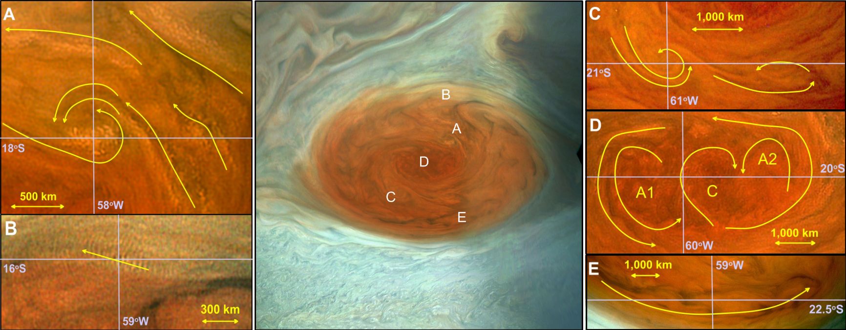 Jupiterko Orban Gorri Handiaren irudia, NASA erakundearen JUNO espazio ontziak hartua. Honako hauen xehetasunak agertzen dira, mugimenduak adierazita (gezi horiak): (A) kumulu konbektiboak; (B) grabitate uhinak; (C) barne zurrunbiloak; (D) nukleo turbulentua; (E ) uhin luzeak. Kreditua: Zientzia Planetarioen Taldea UPV/EHU/JunoCam/NASA/SWRI -