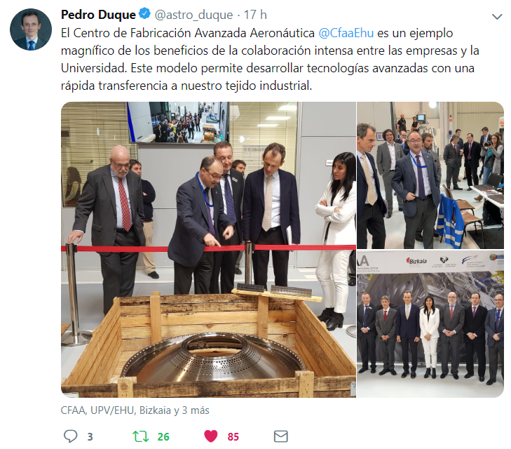 Junto a él se encontraban más personalidades del mundo de la Universidad, ciencia e instituciones, como la Rectora de la Universidad del Pais Vasco/Euskal Herriko Unibertsitatea, Dña. Nekane Balluerka; el Vicerrector de Investigación de la UPV/EHU, D. José Luis Martín González o el Director General de la SPRI D. Alexander Arriola por citar algunos.