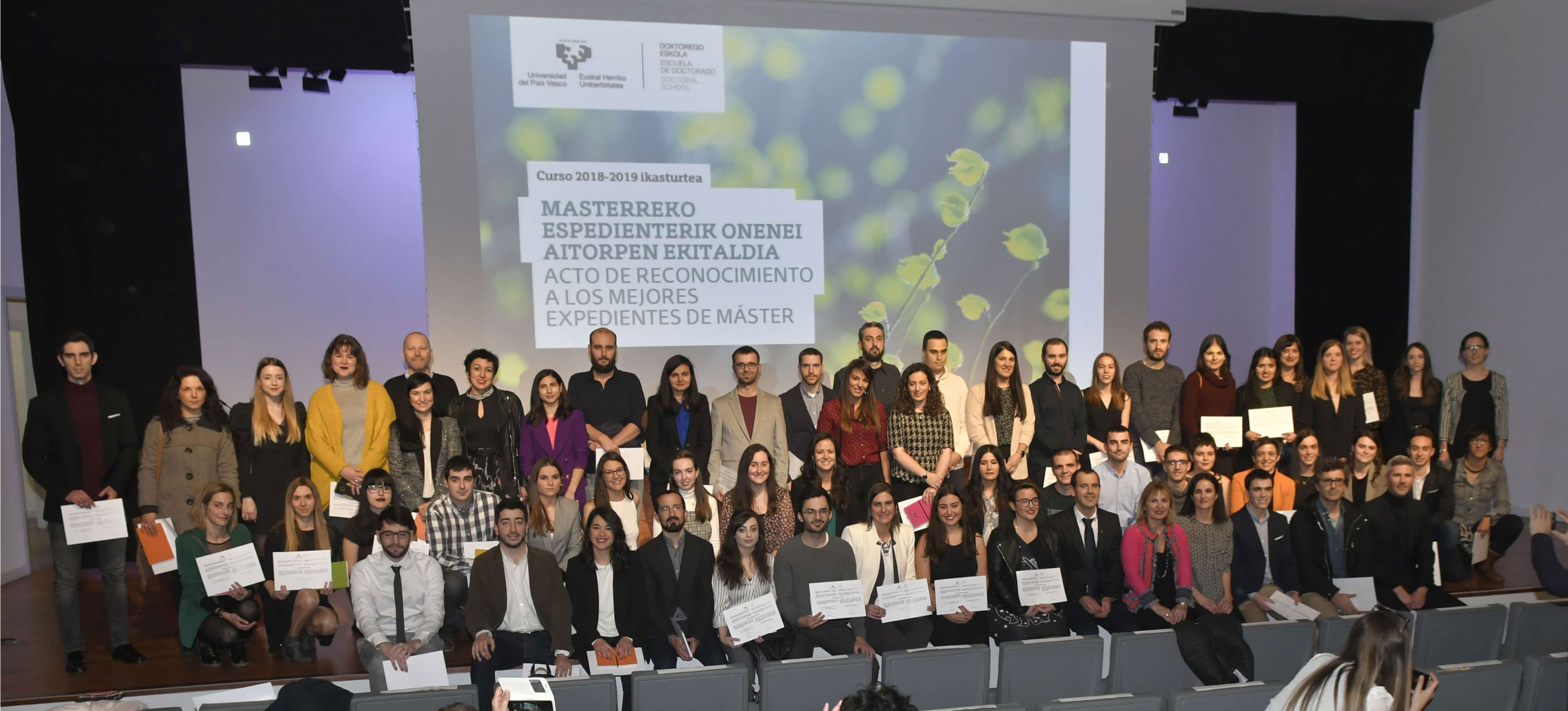 En el contexto de la feria de posgrado “Master Eguna” organizada en los distintos Centros a lo largo de Febrero y Marzo, para que el alumnado se informara de los másteres de su área, el 14 de febrero de 2020 a las 18:30 se celebró en el Bizkaia Aretoa un Acto de Reconocimiento al alumnado con el mejor expediente académico en cada uno de los másteres del curso pasado (2018-2019). En el Acto, organizado por la Escuela de Doctorado (DOKe) y presidido por Josu Sangroniz en representación del Vicerrectorado de Grado y Posgrado, participaron 74 egresados y egresadas a quienes se distinguió e hizo entrega de un diploma y un obsequio conmemorativo.