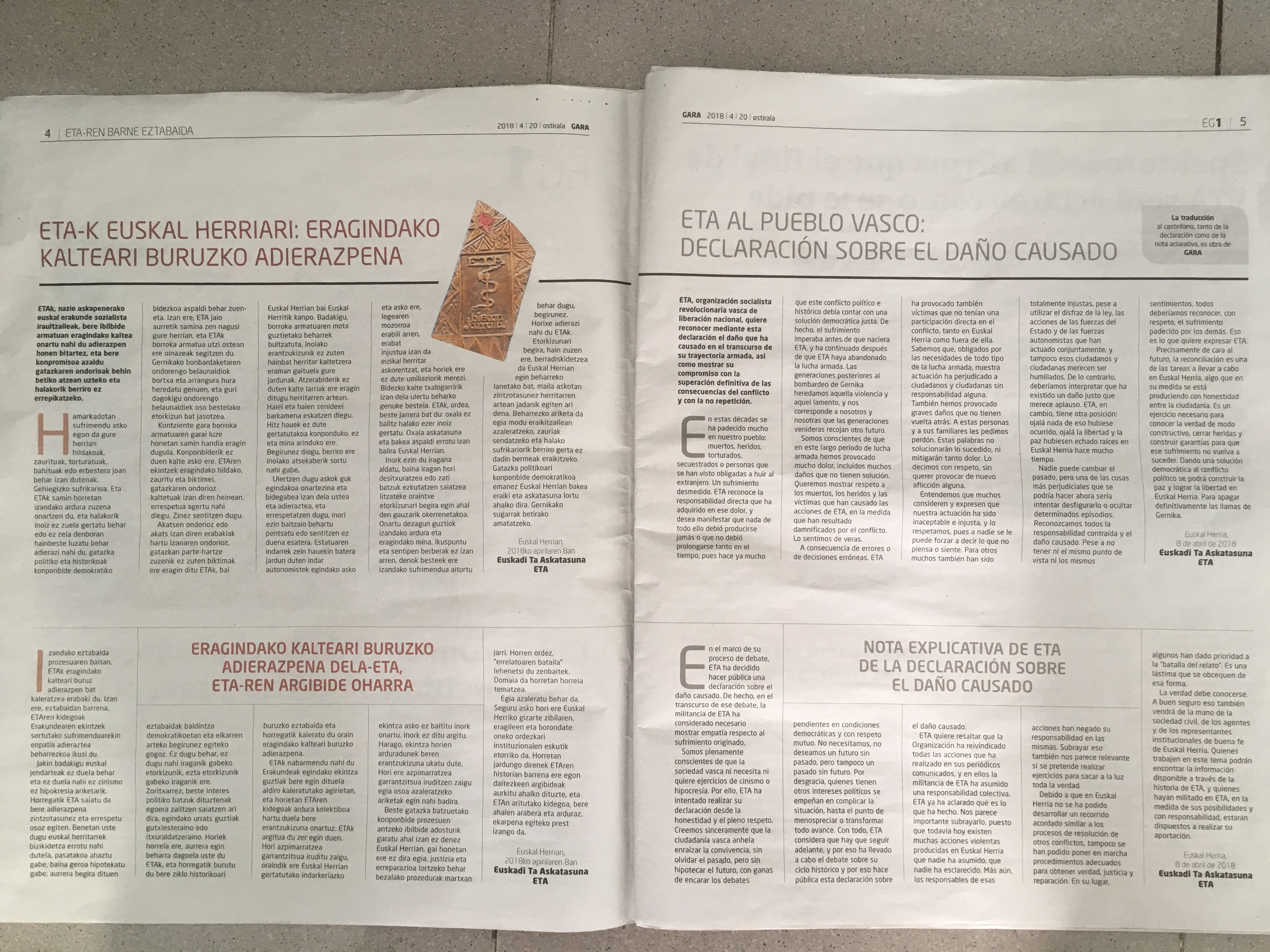 Bitartean, esan dezakeguna, atxikitzen dugun komunikatuak gako asko dakartzala; baina eragindako kaltearen aitortza eta aitortzea hobe inoiz gertatu izan ezbalitz; aurrerapauso gisa ikus daitezke. Baita barkamen eskaera ere bai nahiz eta hankamotz geratu.